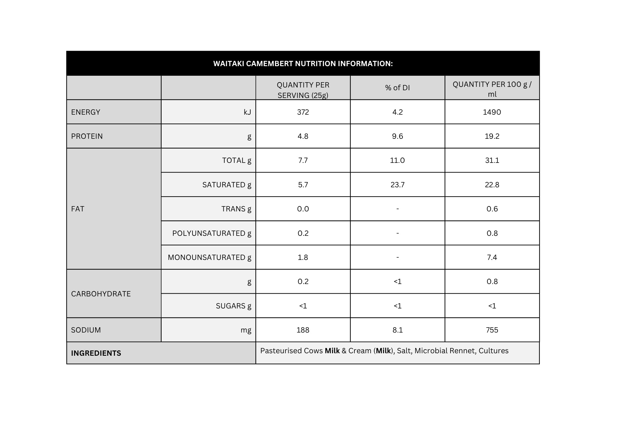 The full rich flavour of Waitaki Camembert captures the quality of Whitestone’s premium milk. The soft ready ripe texture is produced by ‘stabilising’ the curd with higher vat temperatures in the making process.