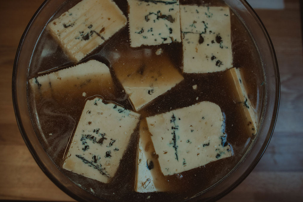 Soak whole Windsor Blue wedge(s) overnight in a bowl of 'The Dubliner - Irish Whisky Liqueur' at constant temperature. Cover to keep it safe.