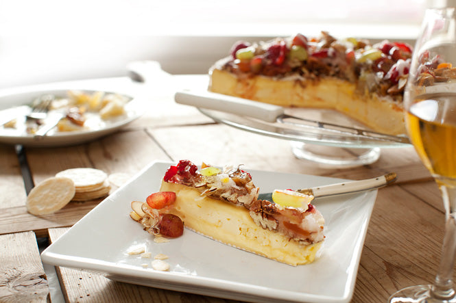 Ripen a maxi wheel of Mt Domet Double Cream Brie. Layer with finely chopped nuts then fresh seasonal fruit and berries (dried fruit if out of season). Generously pour over hot melted toffee and allow to set.