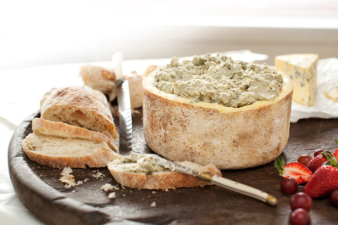 Scoop the cheese from a wheel of Windsor Blue without damaging the outer rind to a large mixing bowl. Mix in a high quality late harvest dessert wine to create a lumpy cottage cheese texture. Return mixture to wheel outer rind and serve with fresh crusty bread.